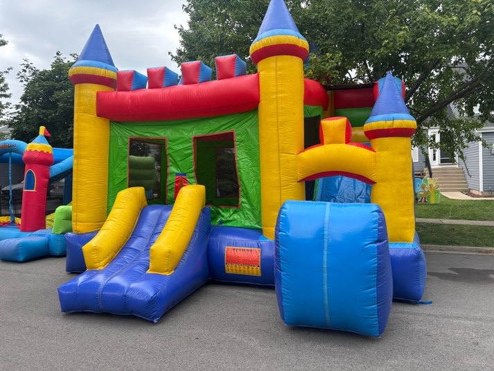The Giant Combo Castle w Slide delivers standout entertainment for birthday parties, school events, and weekend rentals. This inflatable combines a roomy bounce area with a built-in slide and protective roof. It supports approximately 8 children or up to 800 pounds, so more kids can play safely and comfortably. Durable design, quick exit features, and sun protection make it a rental favorite.